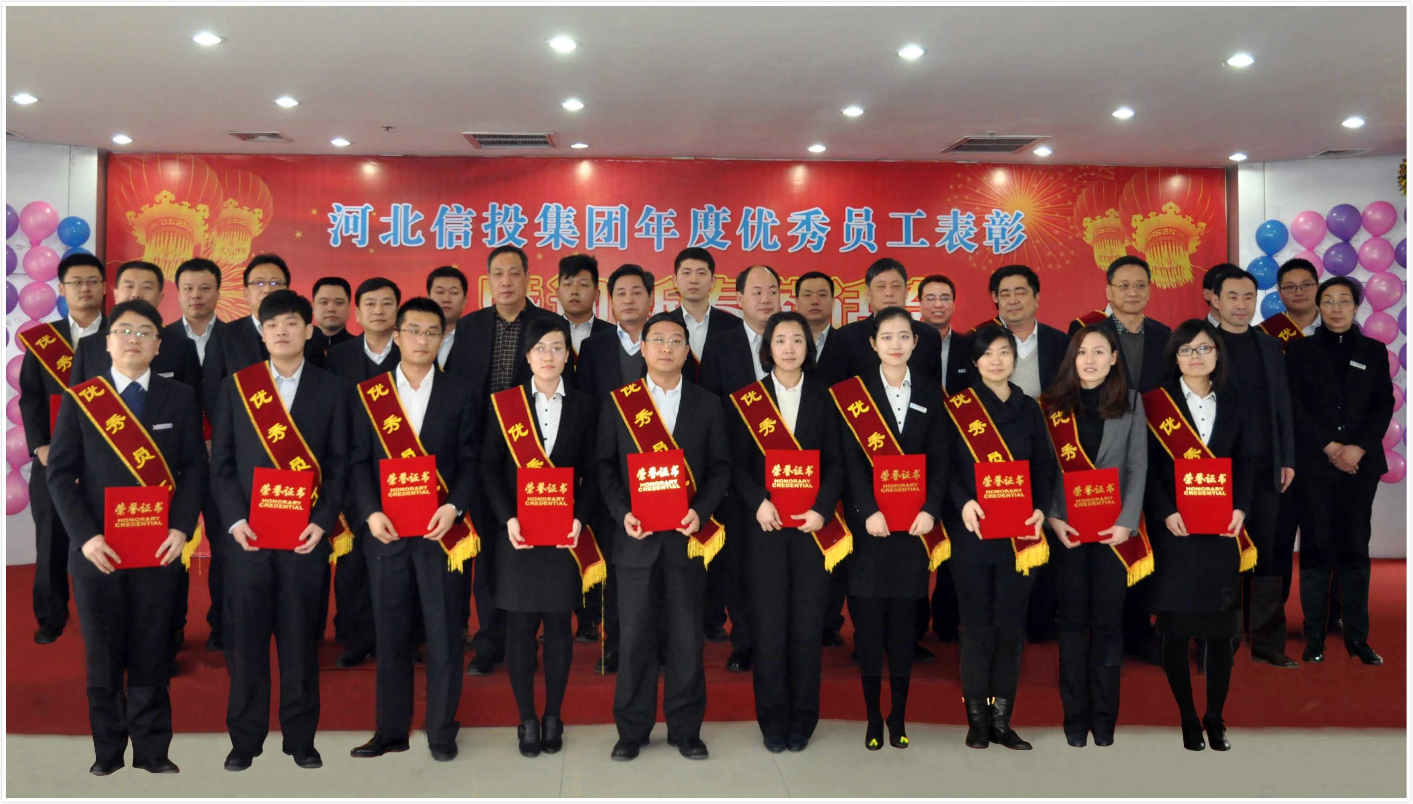 ????集團總經理、黨委副書記、副董事長尉麗峰同志宣讀了《關于表彰2014年度河北信投集團系統優秀員工的通報》。集團領導班子為系統2014年度優秀員工頒獎并合影留念。
