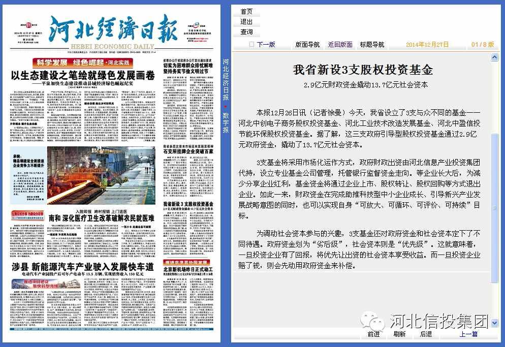 ??????12月27日,《河北日報》、《河北經濟日報》頭版刊登文章《我省新設3支股權投資基金》,爭相報道河北信投集團發起設立3支河北省政府引導基金——電子商務基金、節能環保基金、工業技改基金。同時河北青年報、河北省人民政府網站、河北新聞網國企頻道頭條、河北新聞門戶網站長城網也在第一時間報道了這一新聞。