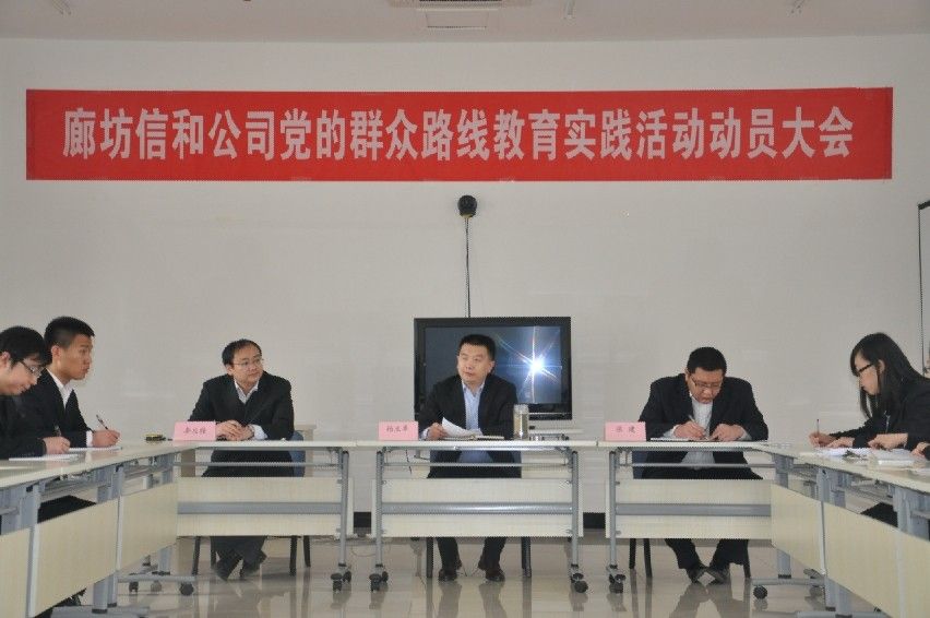 會議由公司副總經理李慶佳主持,會上,公司副總經理張建宣讀了《廊坊信和軟件投資有限公司關于開展黨的群眾路線教育實踐活動實施方案》,董事長楊立卓傳達了中央、省委、省國資委文件精神及集團公司召開的黨的群眾路線教育實踐活動動員大會精神,并就集團公司活動要求做動員講話。楊立卓董事長首先深刻闡述了開展黨的群眾路線教育實踐活動的重要性、必要性和迫切性,要求全體職工必須高度重視此項活動開展,并結合廊坊公司現狀提出了具體要求:一是加強學習,學習中央、省委及省國資委和集團公司的文件精神;二是希望廣大員工對公司領導班子提出誠懇的意見和建議,共同完成好此次教育實踐活動;三是公司全體人員要以本次活動為契機,及時查擺工作中的突出問題,確保教育實踐活動取得實實在在的成效,服務于公司發展、服務于解決職工工作生活中的具體問題。